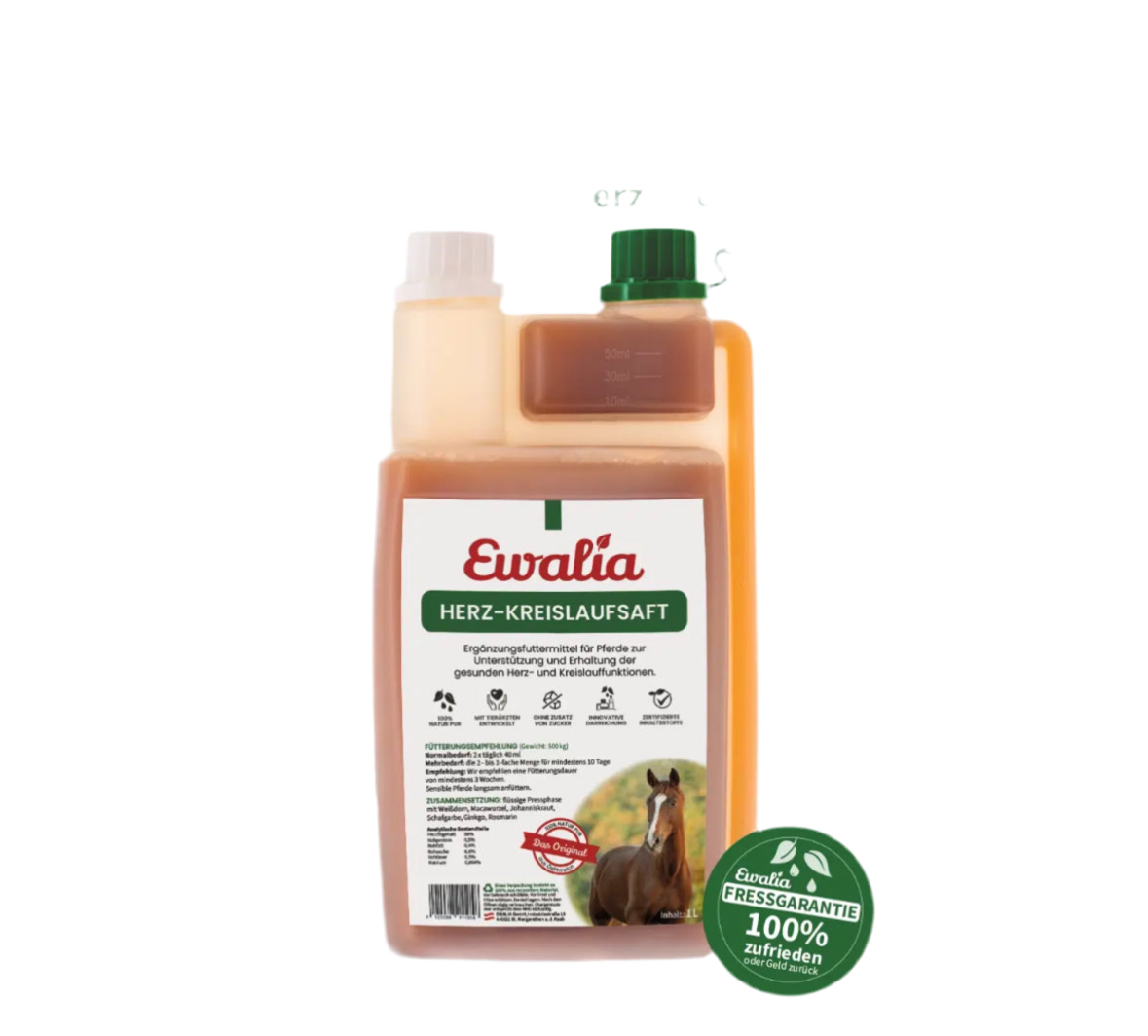 Der Herz-Kreislaufsaft unterstützt die natürliche Erhaltung und Stabilisierung der Herz- und Kreislauffunktionen deines Pferdes. Die sorgfältig ausgewählten Kräuter in Arzneibuchqualität fördern die Durchblutung, stärken die Gefäße und tragen zu einem gesunden Kreislauf bei.