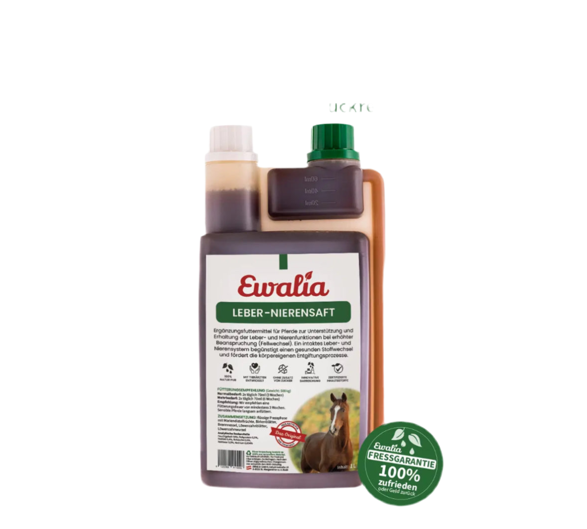 Der Leber-Nierensaft unterstützt die körpereigenen Entgiftungsprozesse von Leber und Nieren auf natürliche Weise. Die einzigartige Kräutermischung in Arzneibuchqualität fördert Stoffwechsel und Widerstandskraft, entlastet die Entgiftungsorgane und stärkt das Immunsystem von innen. Ein intaktes Leber- und Nierensystem begünstigt einen gesunden Stoffwechsel und unterstützt die natürliche Entgiftung des Pferdes.