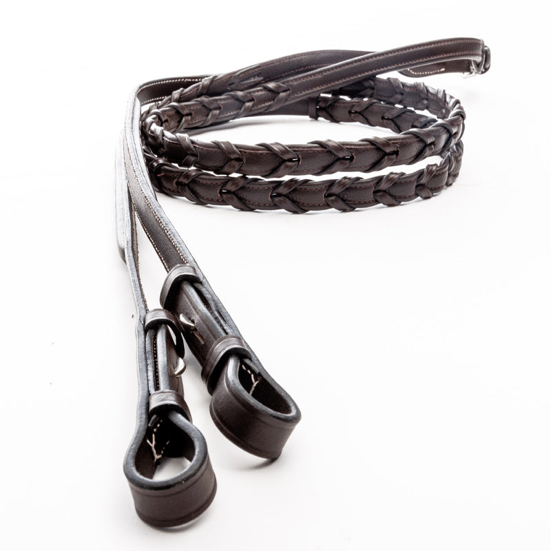 Feine Ziernähte auf Stirn- und Nasenriemen verleihen der Trense einen dezenten Look. Ein besonderes Detail sind die Softleder-Hunterzügel, die mit zwei Lederriemen umflochten sind. Sie liegen angenehm in der Hand und bieten gleichzeitig sicheren Halt beim Reiten.