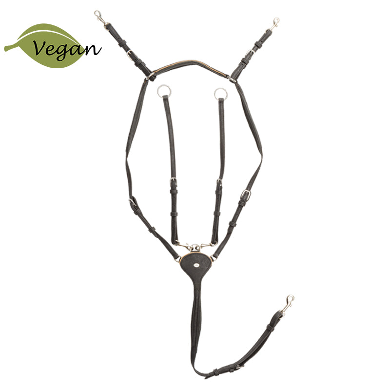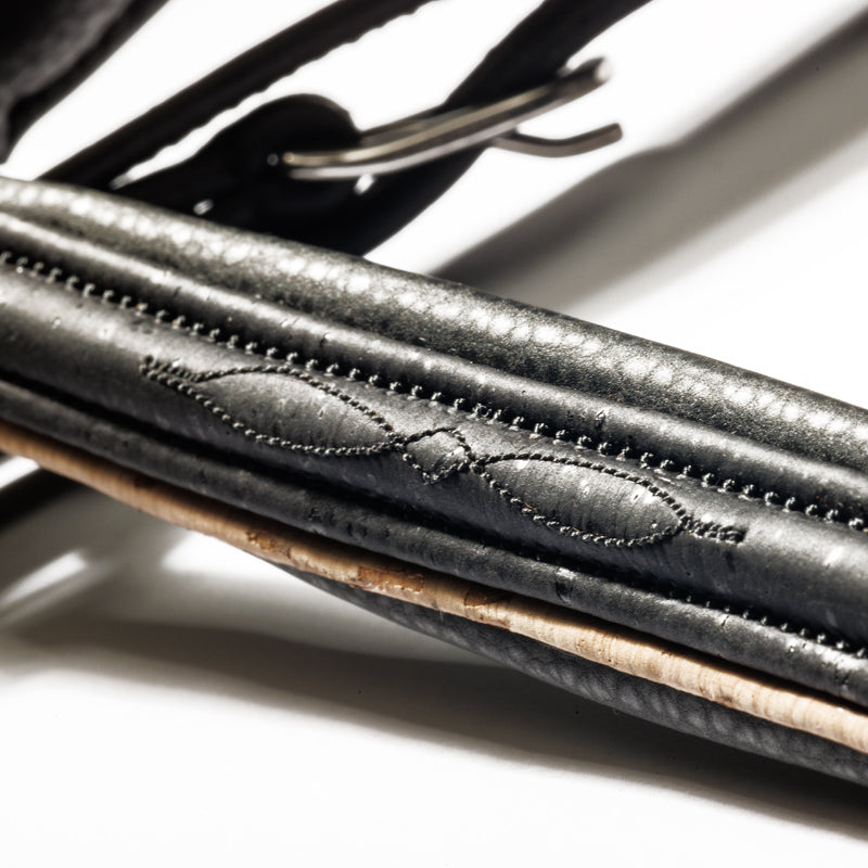 Das vegane 3-Punkt-Vorderzeug „Cortica“ überzeugt durch seinen schmalen, eleganten Schnitt und die kontrastfarbenen Korkbiesen, die ihm eine moderne und edle Optik verleihen. Es ist mehrfach verstellbar, individuell anpassbar und mit einem abnehmbaren Karabiner ausgestattet. Auf Elastzonen wird bewusst verzichtet – für eine ruhige, stabile Lage am Pferd.