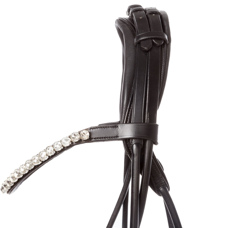 Die rundgenähte Trense Florina KavalSH4 überzeugt durch edles Design und hohen Tragekomfort. Gefertigt aus hochwertigem deutschem Qualitätsleder, besticht sie durch rundgenähte Seitenriemen, ein schmales, geschwungenes Stirnband mit großen weißen Strasssteinen und einen breiten, lackierten Nasenriemen, der konisch zuläuft. Das anatomisch geformte, weich gepolsterte Genickstück sorgt für optimale Druckverteilung und besonderen Komfort.