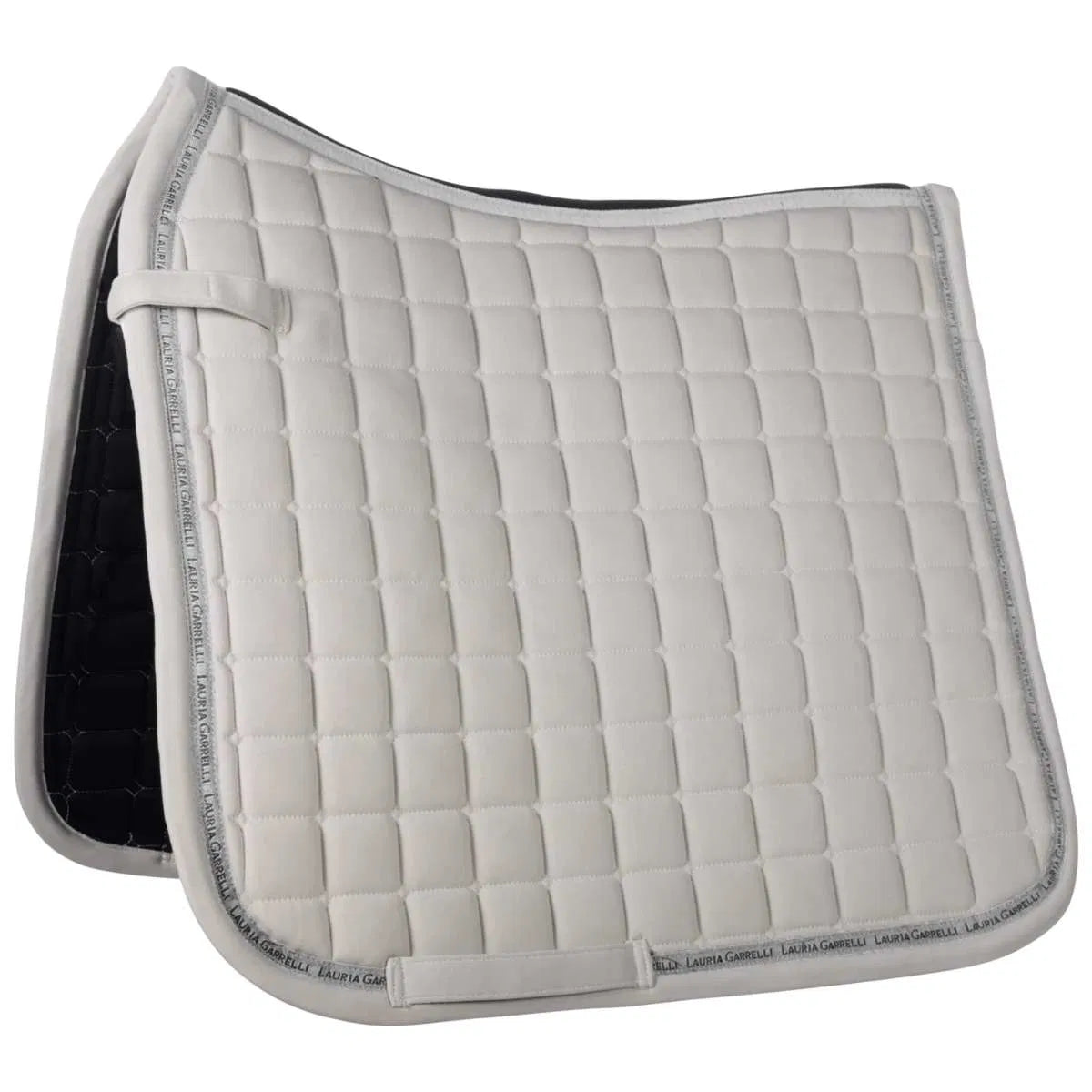 Moderne Dressurschabracke aus der Lauria Garrelli Kollektion mit funktionellen Materialien und durchdachtem Design. Der 3D-Mesh-Einsatz am Wirbelkanal sorgt für optimale Luftzirkulation und ein angenehmes Klima unter dem Sattel.