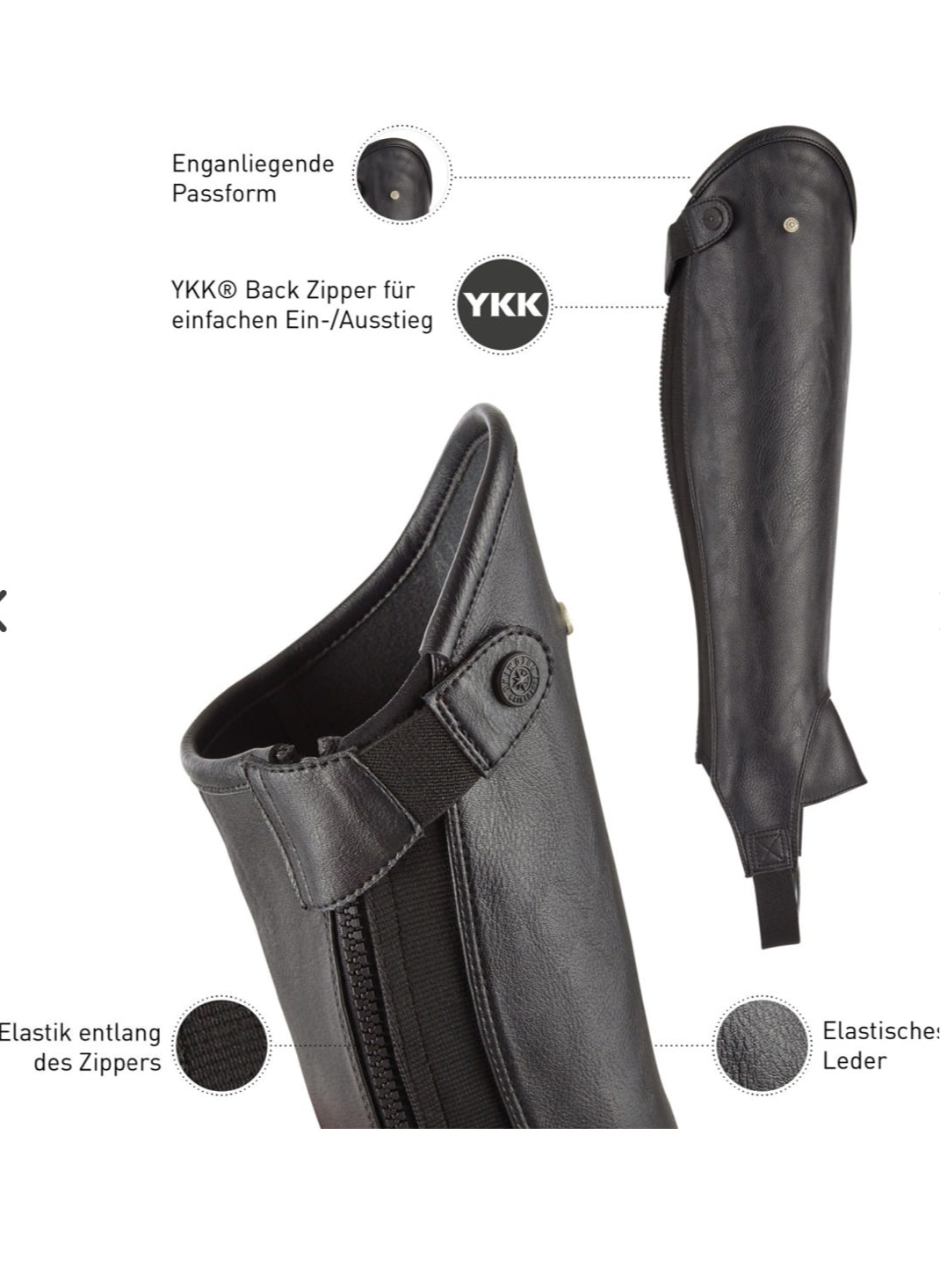 Dank des YKK® Vislon Back Zippers lässt sich der Chap leicht an- und ausziehen, während der hohe Dressurbogenfür einen klassischen, stilvollen Look sorgt. Perfekt geeignet als preiswertes Einstiegsmodell, ohne auf Qualität und Komfort zu verzichten.